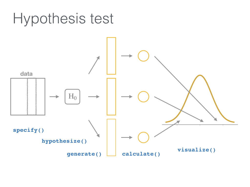 specify()指定解释变量和被解释变量 (y ~ x)hypothesize()指定零假设 (比如,independence=y和x彼此独立)generate()从基于零假设的平行世界中抽样:- 指定每次重抽样的类型,通俗点讲就是数据洗牌,重抽样