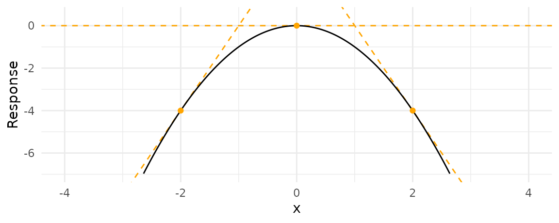 - 当$x>0$,斜率为负,x增加y也减少,在这个位置上边际效应为负